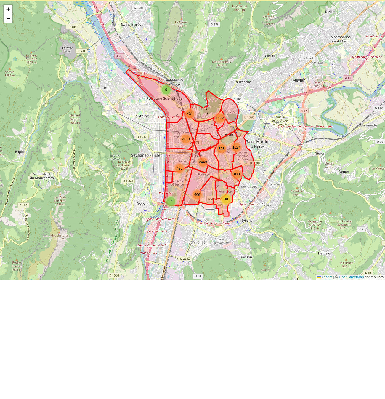 L.geoJSON) pour le fichierUNIONS_DE_QUARTIER_EPSG4326.jsonet ajoutez-la à la carte. - Créez une couche Leaflet de cluster de marker en vous aidant des instructions présentes ici.