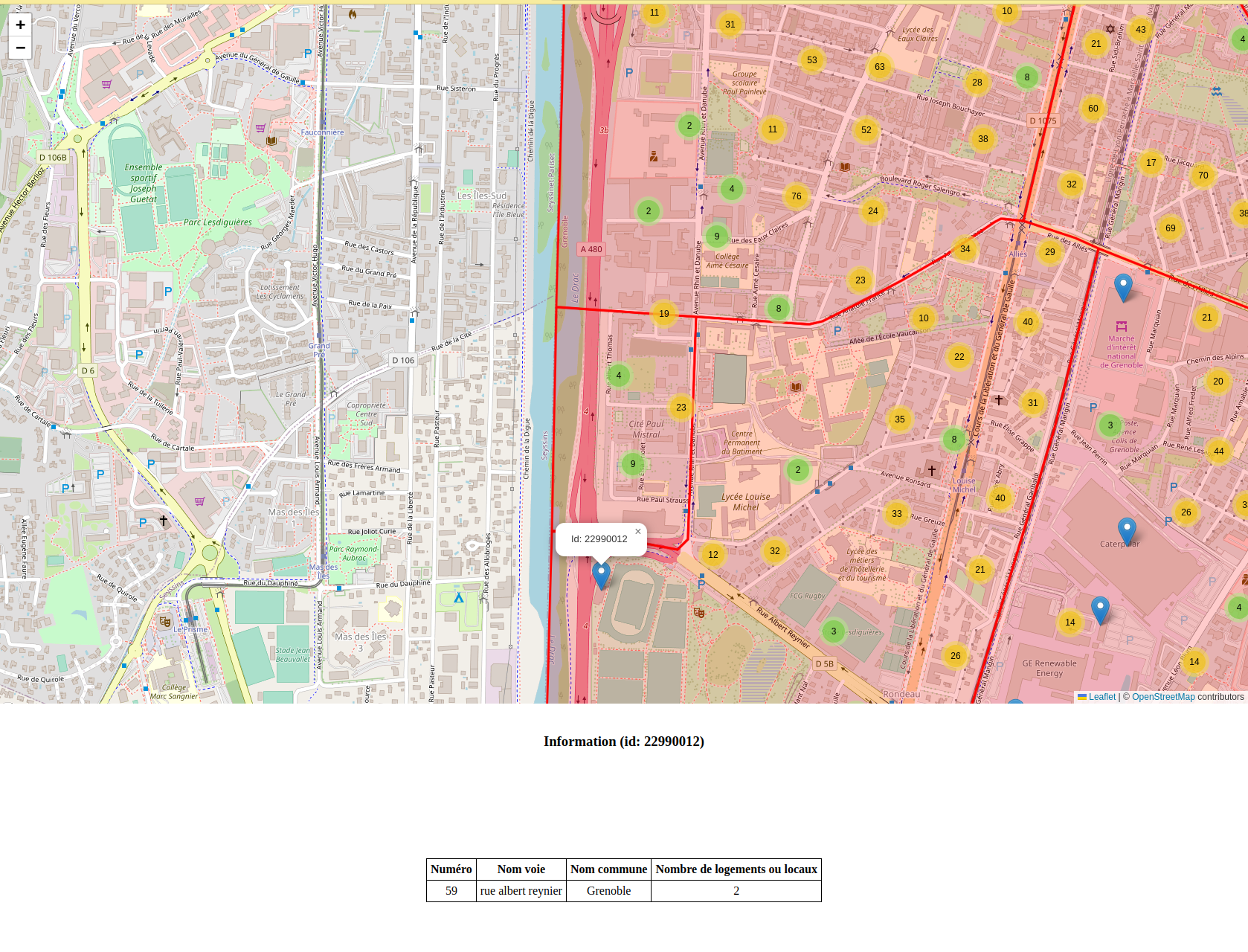 divajoutée précédemment sous la carte (cf. exemple en screenshot ci-dessous) en utilisant les variablesimb_id,addr_nom_commune,addr_nom_voie,addr_numeroetimb_nbr_loglocprésentes dans les données. - Écoutez l’événement “clic” sur la carte. Lorsque le clic se produit, effacez le contenu de la