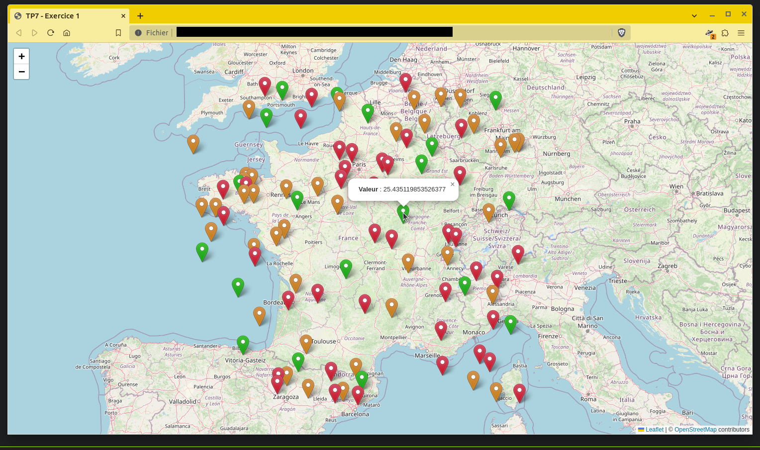 script-exercice1.js.Affichez un marqueur pour chacun des points d’intérêt. Ce marqueur doit être d’une couleur différente en fonction de la valeur associée au point d’intérêt (inspirez-vous de l’exemple fourni ici pour créer des marqueurs colorés) :